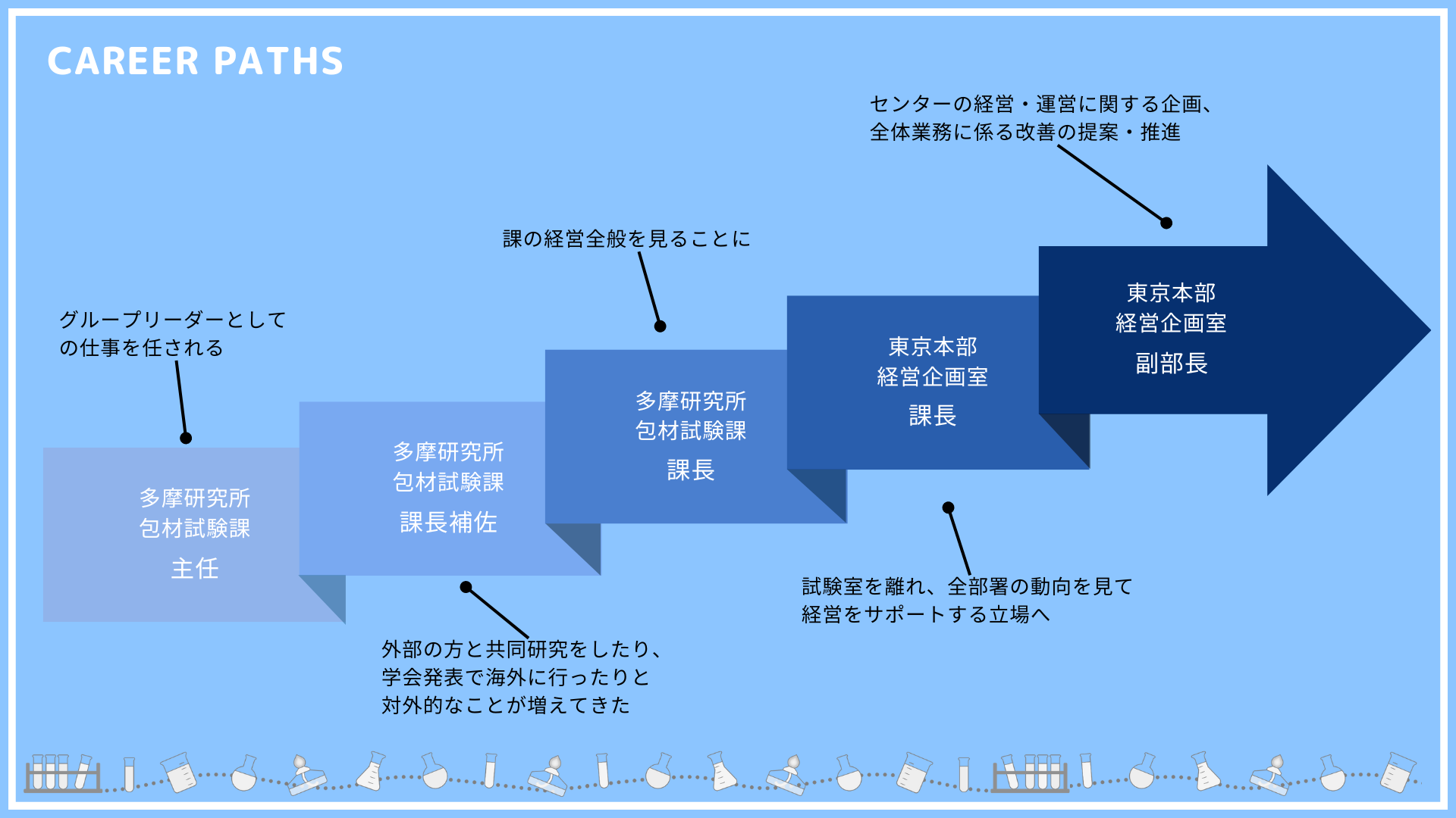 最初の分岐点は包材試験課の課長補佐になった時です。課の運営に関わるようになり、視野が広がりました。また外部の委員会や検討会に参加したり、学会発表をしたりする機会も増え、対外的な活動も多くなりました。その後は課長として、課の運営やお金の管理など、計画を立てるのは大変でしたが、自分の進めたいように組織を作っていけるので大きなやりがいを感じていました。