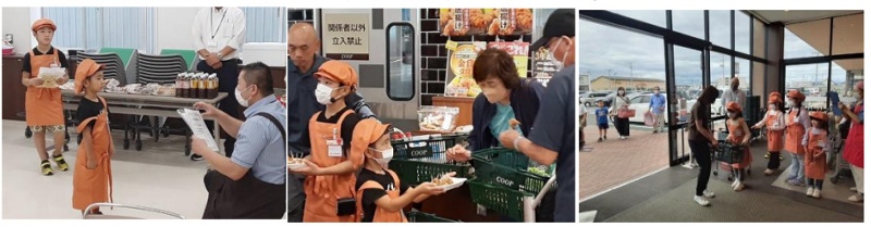 試食をお勧めして「おいしいね~」「かんばってね~」と組合員の皆様からあたたかいお言葉をかけていただき、やや緊張気味の子どもたちもパッと笑顔になり、生協ならではのやさしい空間になりました。