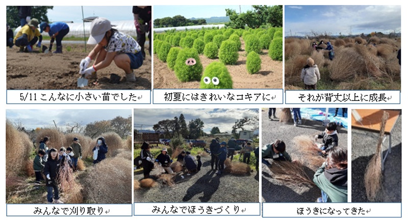 春に小さい苗を植えるところから始まり、鮮やかな緑のもふもふが鮮やかな赤に変わり、そして秋になり2m以上の大きさに立派に育ったコキアを収穫してマイほうきづくり。
