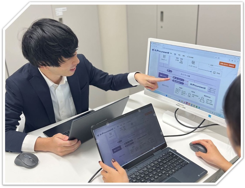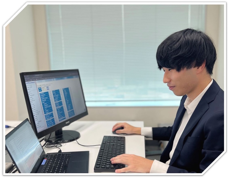 私は楽々ProcurementIIという、多様な購買品目や発注形態に対応した購買管理システムの開発・改善を担当しています。簡単に言うと、業務に必要なノートやPC、デスクなどを購入する際に、誰が何を購入して、誰が決裁したのか、購入に関する情報を管理するシステムですね。特徴は、購入依頼から発注、見積、入荷検収、購入品のカタログ管理、決裁のワークフローまで購買業務全体を電子化することで、購買コスト削減や業務効率化に繋がる点です。業務に関して、私は学生時代に情報系の学科にいたため、プログラミングに対して苦に感じることはないですが、自分のミスで周囲に迷惑をかけてしまうため、そこは注意して業務に取り組むようにしています。実際現場のシステムを開発するのは難しいですが、先輩に疑問点を聞けばすぐに答えてくれますし、優しい方ばかりなのでリラックスして働くことが出来ています。