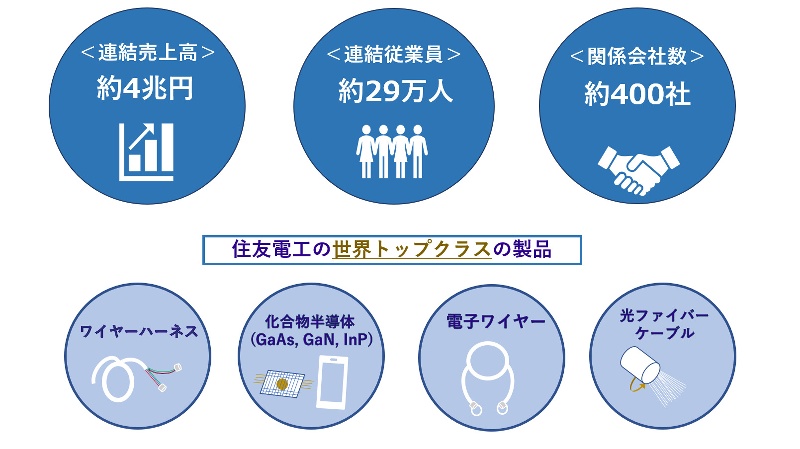 私たち住友電工情報システム(略称:SIS)は、全世界約40ヶ国で約400社の連結会社を持ち、従業員数約29万人に及ぶ住友電工グループの一員です。住友電工グループは主に企業向けのBtoB製品を製造しているため、一般の人々にはなじみがないかもしれませんが、世界トップシェアの製品をいくつも持つグローバル企業です。私たち住友電工情報システムは、そのグループ力を強みとし、国内外で先進のIT事業を幅広く展開しています。